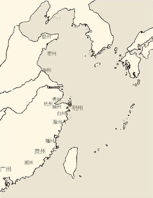 明星城市从北到南,主要包括治所在今山东省蓬莱市的登州,山东省胶州市的密州,江苏省连云港的海州,浙江省嘉兴市的秀州,浙江省绍兴市的越州,以及浙江省的台州和温州,福建省的福州,广东省的潮州。但最重要的,除南宋临时首都杭州,便是现在叫作宁波的明州,以及福建的泉州和广东的广州,它们是宋代海外贸易的三大巨星。