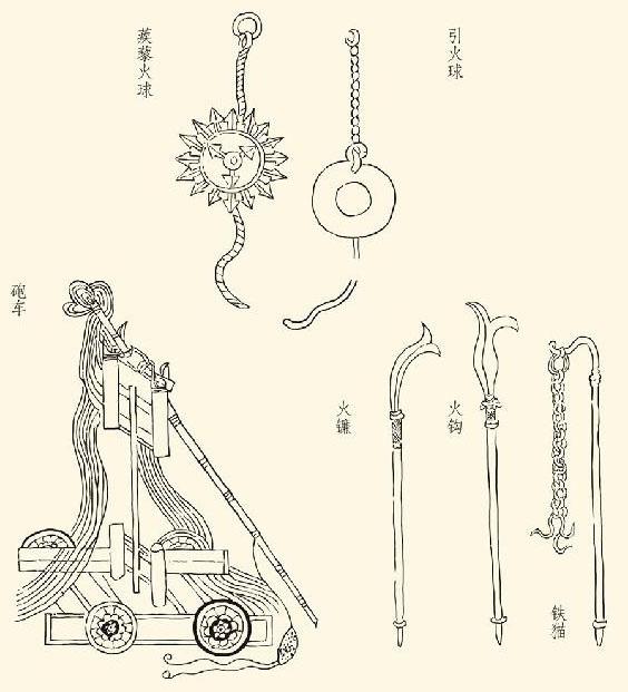 好在宋人的防卫技术和设备堪称一流。尤其是弩,对付骑兵颇具杀伤力。唐代发明的火药也大量使用于战争,燃烧性火器如火箭、火枪、火球、喷筒,爆炸性火器如炸弹都被发明出来。原本作为抛石机的砲(不能写成炮),也不仅抛掷石弹,还抛掷燃烧弹和各种爆炸性火器。